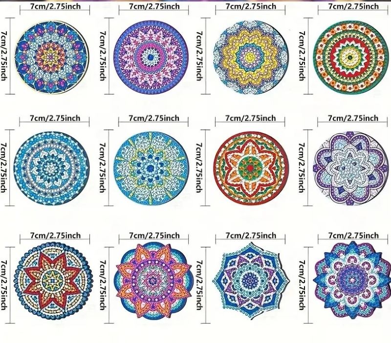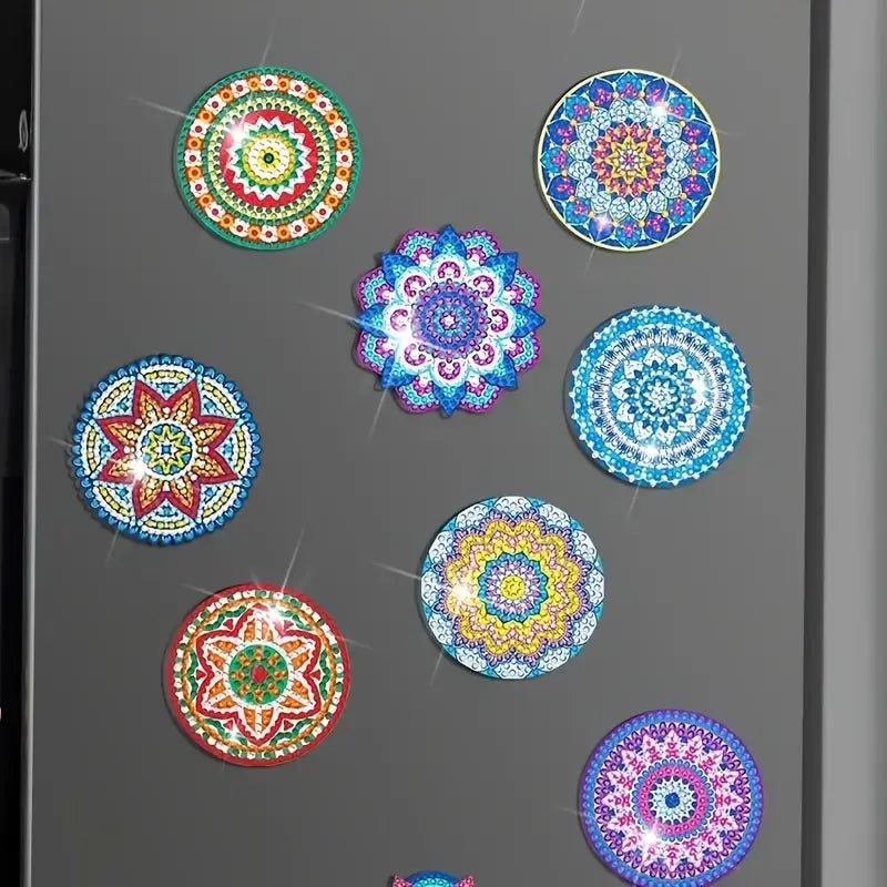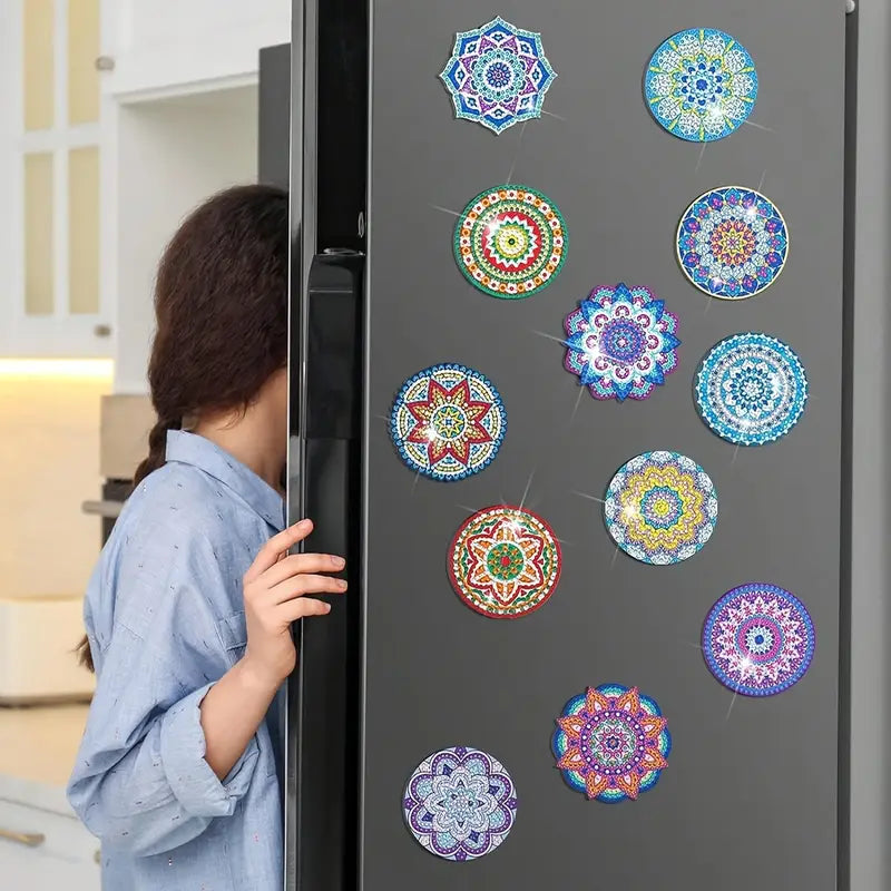 Breng kleur en creativiteit in huis met deze unieke diamond painting magneten set van 12 mandala's! Deze prachtige mandala's zijn niet alleen leuk om te maken, maar ook perfect om je koelkast, whiteboard of andere metalen oppervlakken op te fleuren.