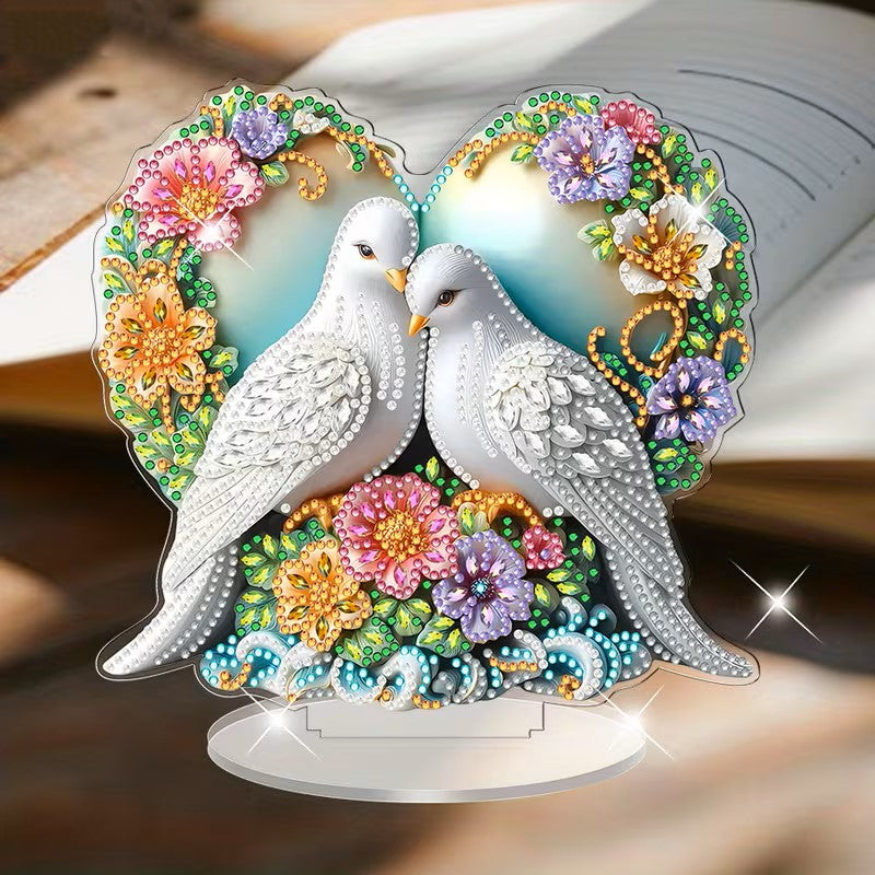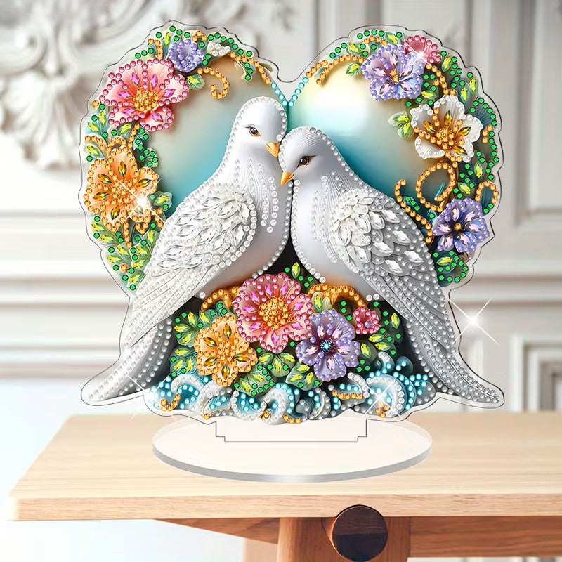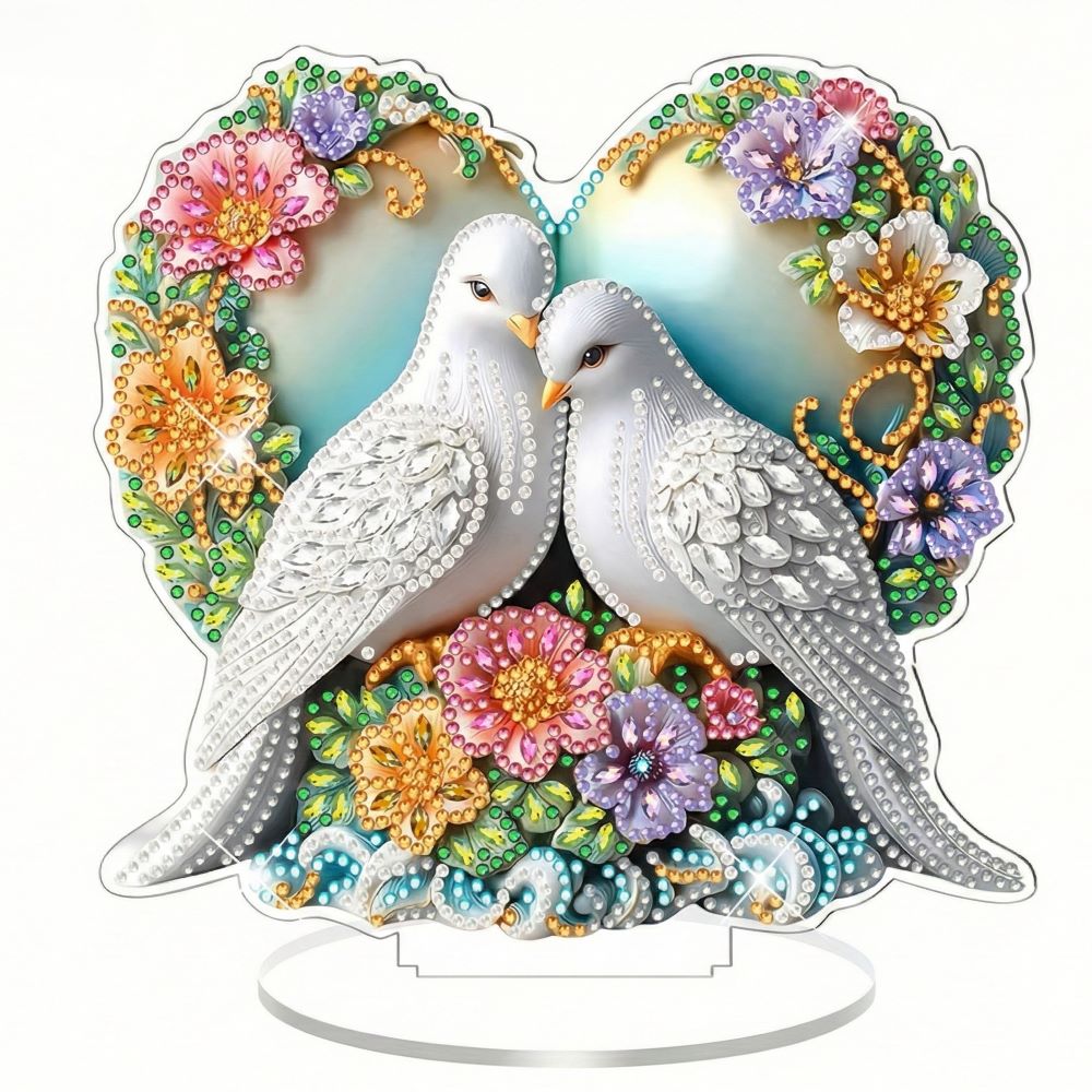 Breng liefde, rust en elegantie in huis met ons Diamond Painting Duiven Ornament! Dit romantische ontwerp toont twee witte duiven die samen een hart vormen, omringd door kleurrijke bloemen en fonkelende details.